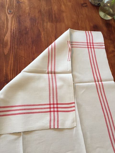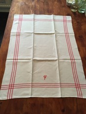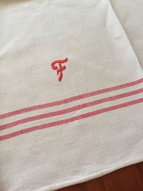 リネン織、赤いラインにイニシャルfの刺繍が施されています。